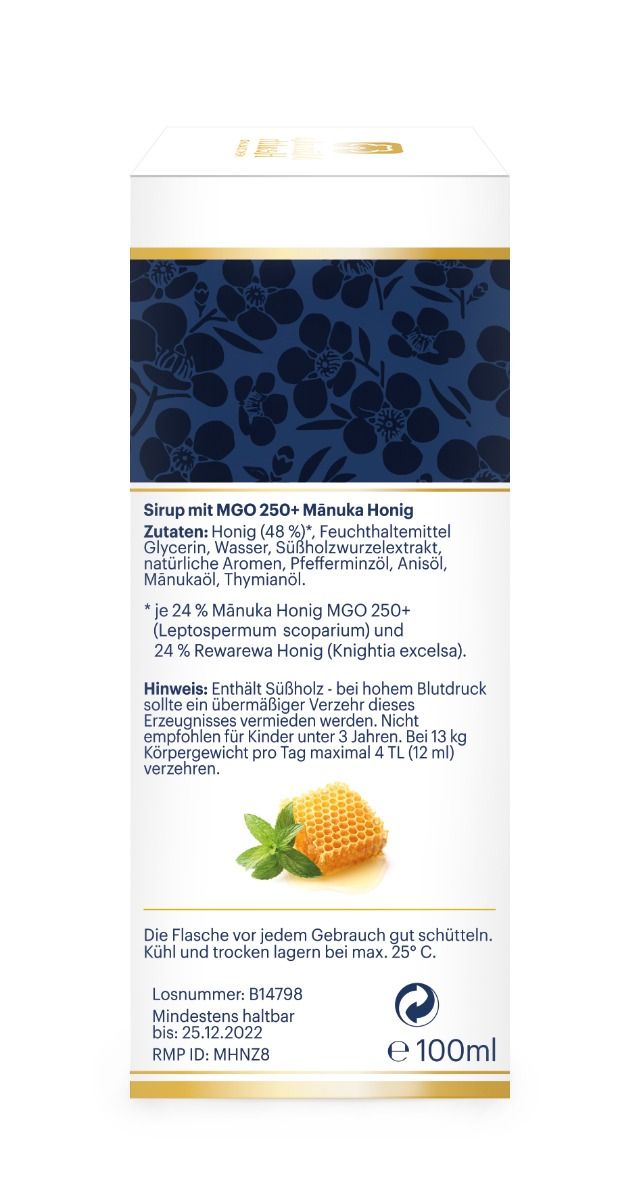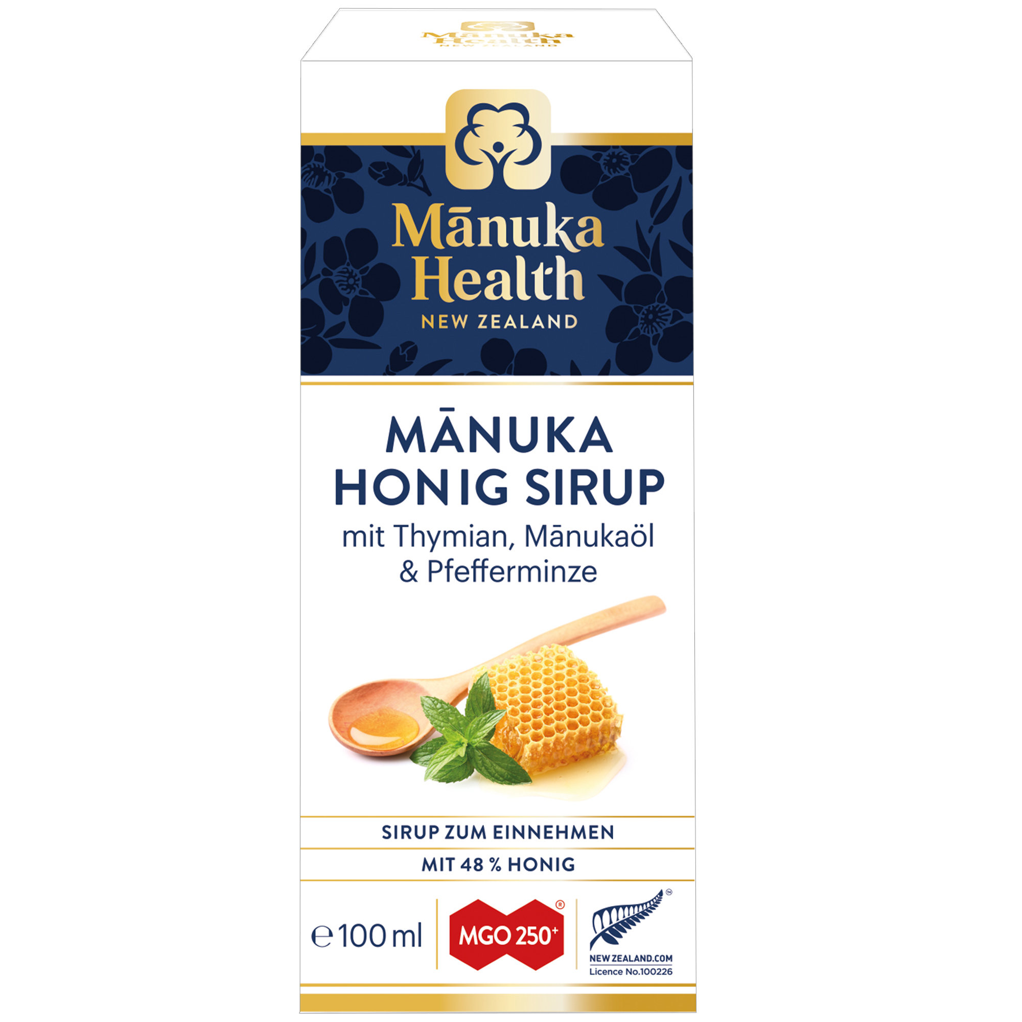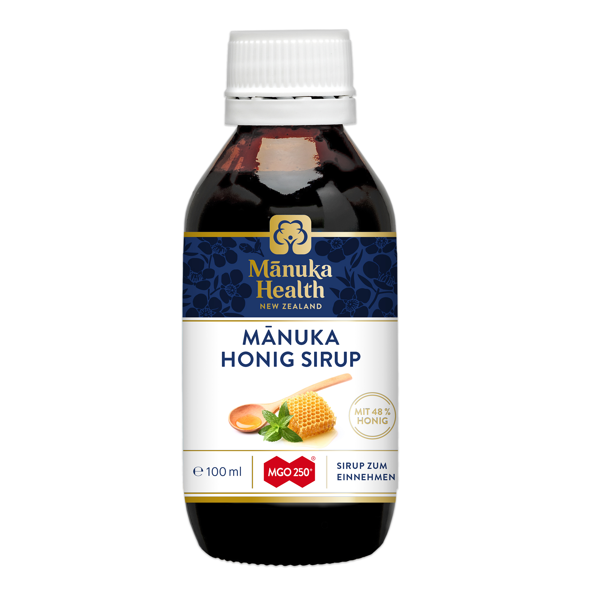 Der Manuka Honig Sirup MGO 250+ von Manuka Health mit erlesenen Zutaten aus Neuseeland, ideal zur Unterstützung und Stärkung des Wohlbefindens, auch für die kalte Jahreszeit. Der Sirup besteht zu 24% aus MGO 250+ Manuka Honig mit einem MGO (Methylglyoxal) Gehalt von mindestens 250 mg pro kg Honig und zu 24% aus neuseeländischem Rewarewa Honig.
